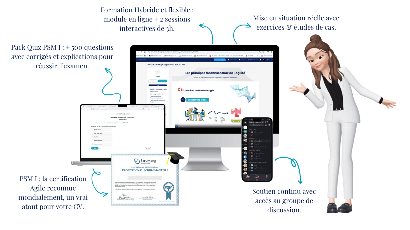 En bonus, vous avez accès gratuitement au pack d'examen PSM I afin de vous préparer sereinement à la certification.