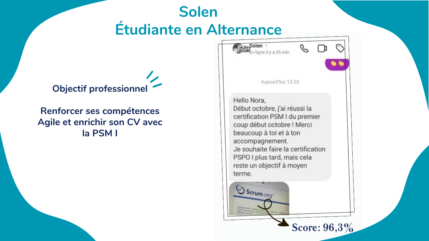 Bonjour à toi, ici Nora ! Je suis ingénieure en Informatique et Systèmes d’Information, diplômée de l’UTT. Passionnée par la technologie et les solutions innovantes, j’ai débuté ma carrière comme consultante SAP, où j’ai eu l’opportunité de travailler au cœur d’une entreprise en pleine transition agile. C’est à ce moment que j’ai découvert Scrum, un cadre qui a transformé notre manière de collaborer et qui a éveillé en moi une véritable vocation :